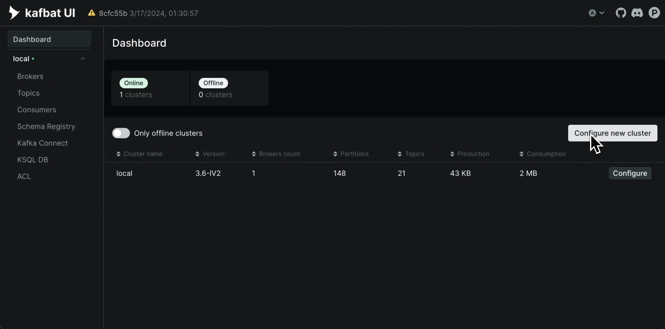 The streamlined dashboard provides clear insights into vital Kafka metrics—Brokers, Topics, Partitions, Production, and Consumption—making it easier to keep your systems running smoothly.